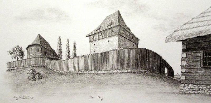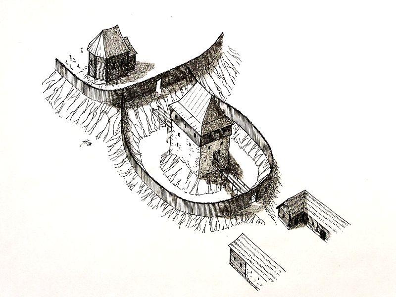 Hypotetický pohled na soubor tvrze, kostela a bývalého dvora