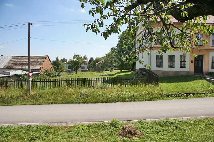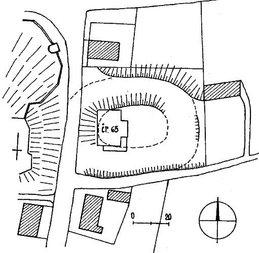 celkový pohled na plochu bývalé tvrze s objektem školy čp. 65 na jejím centrálním pahorku