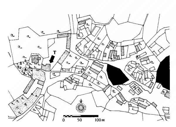 Záboří (Strakonice), výřez z kat. mapy vsi z r. 1837.