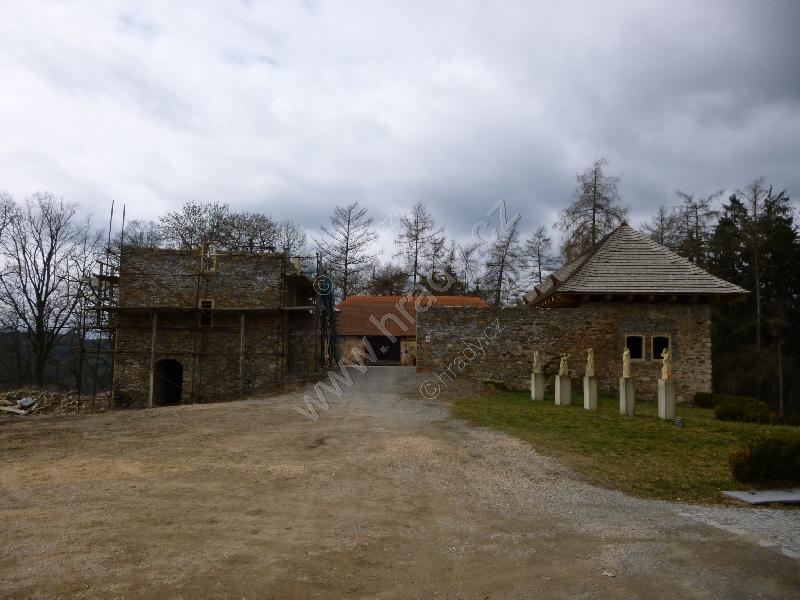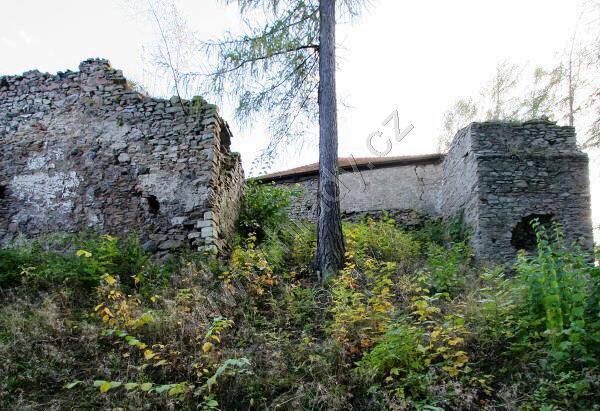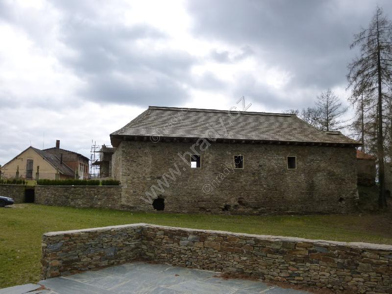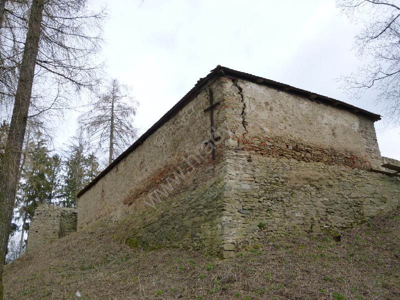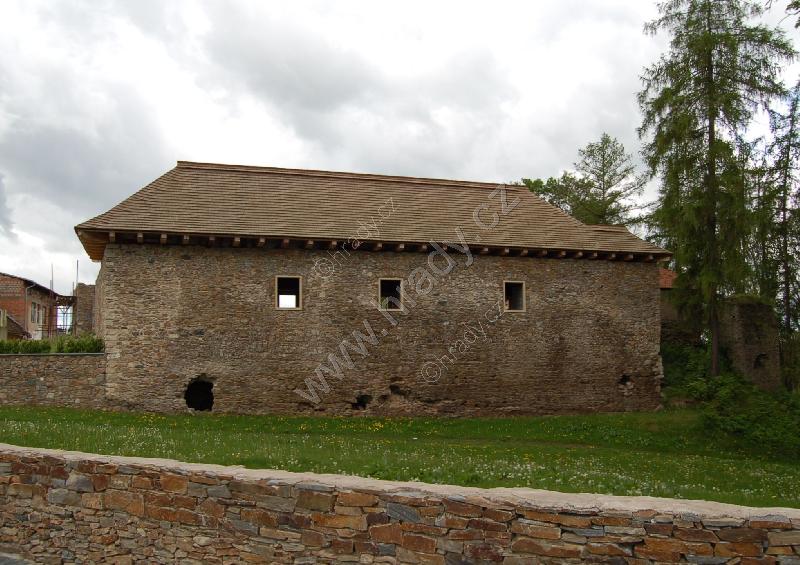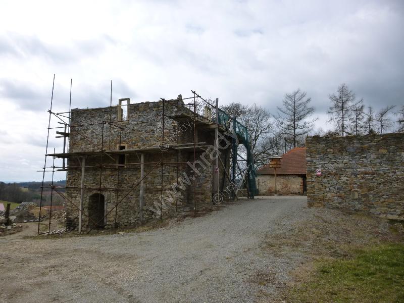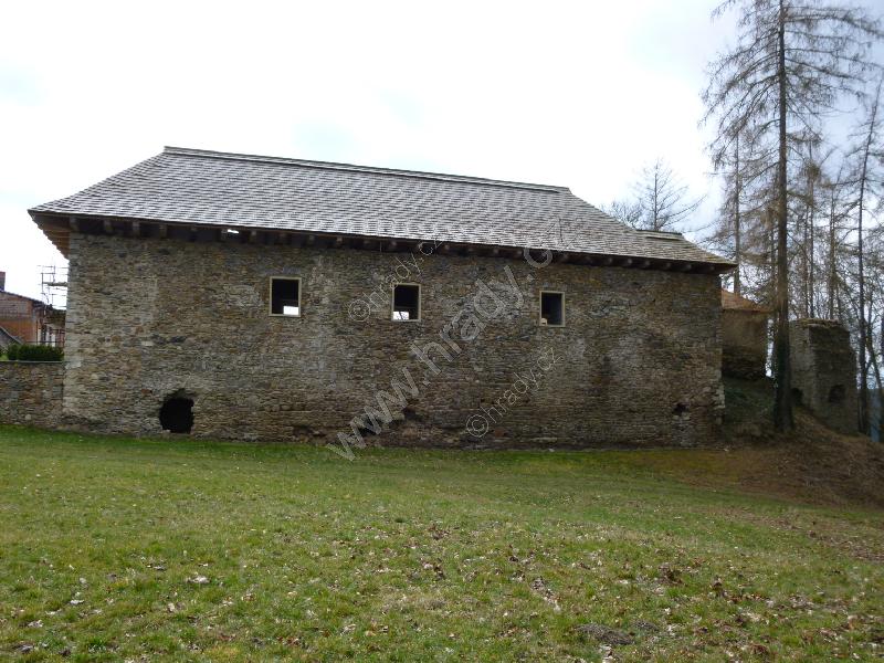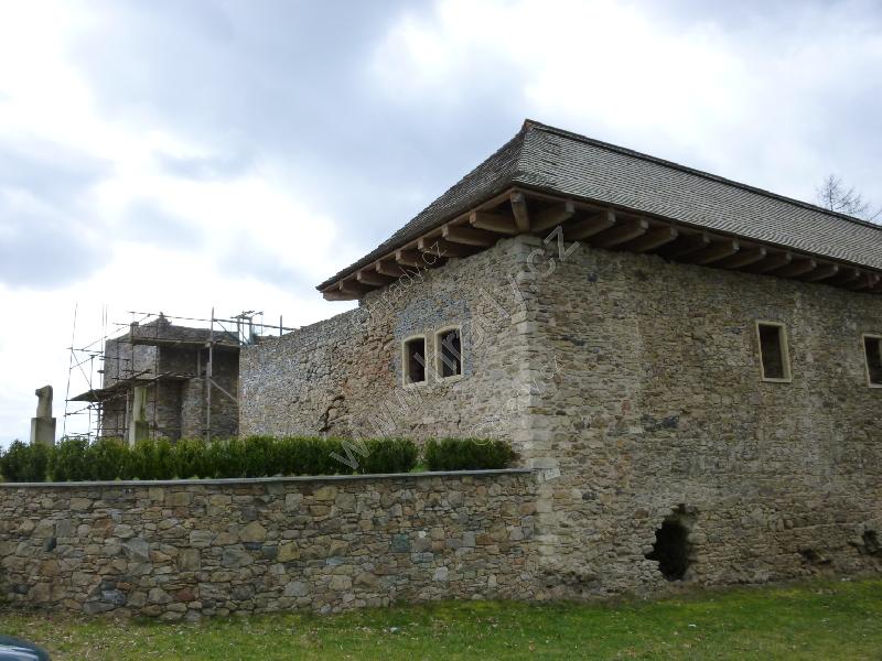 Celkový pohled od východu, vlevo upravené zbytky původní věže