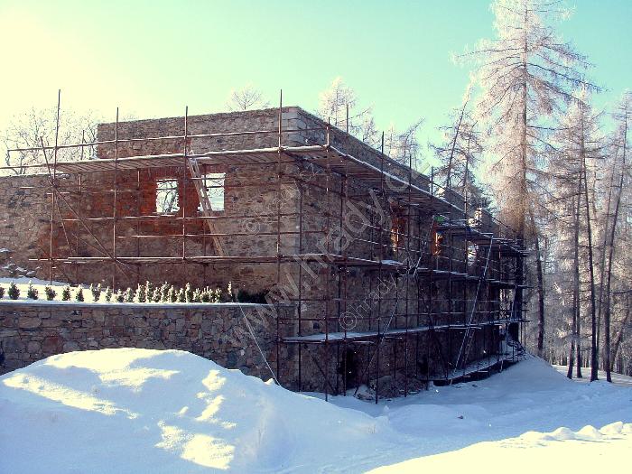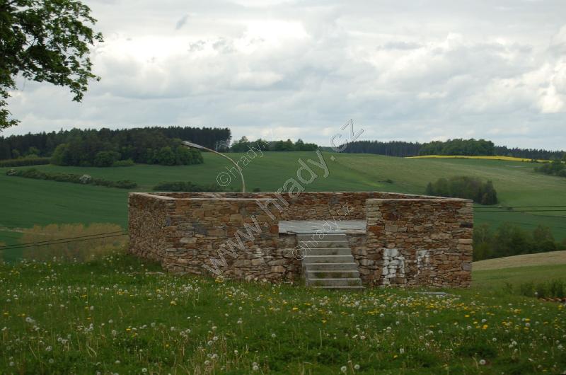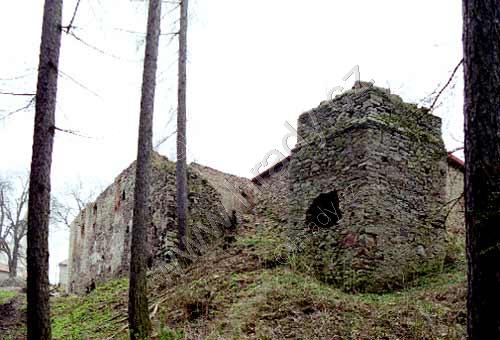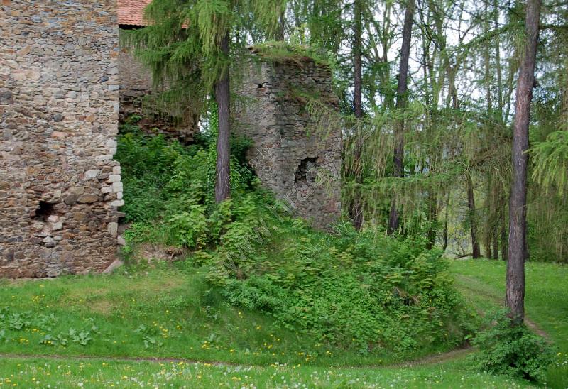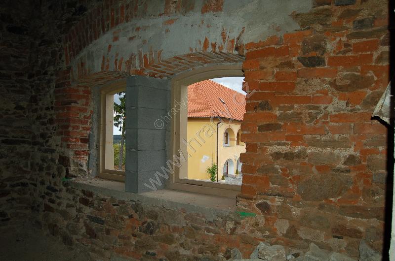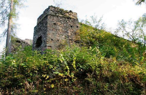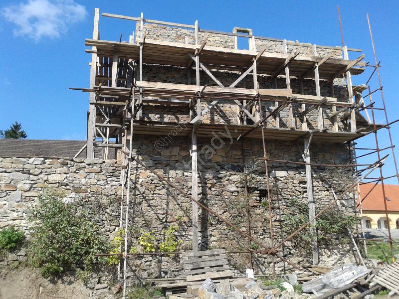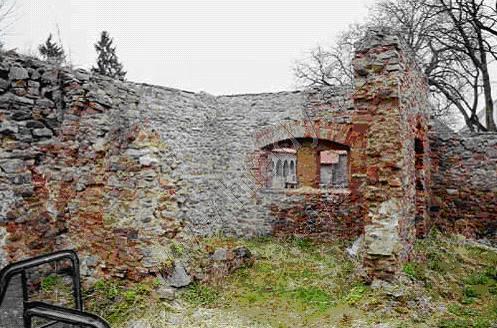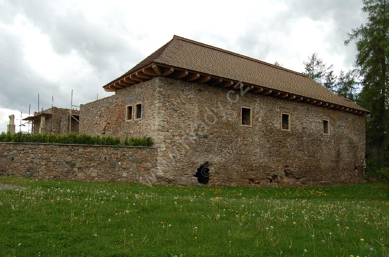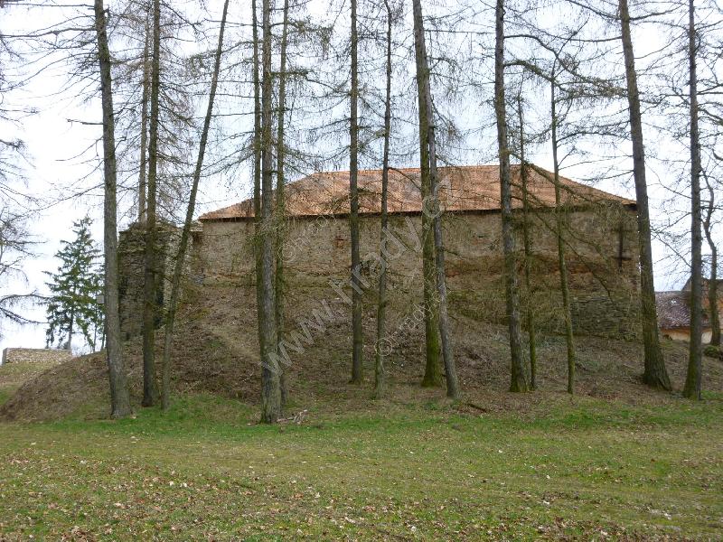 Celkový pohled od východu, vlevo upravené zbytky původní věže