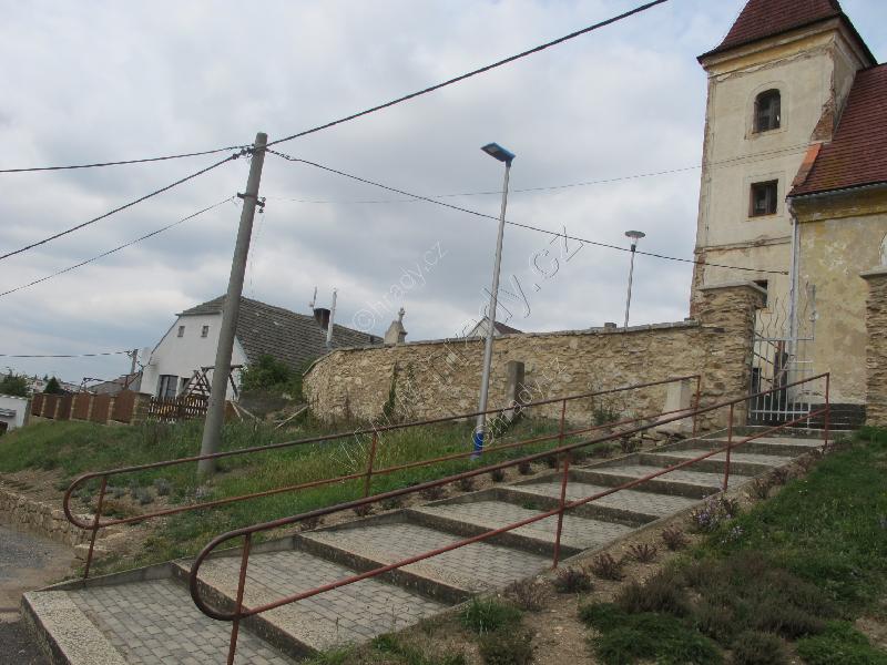 Pohled na místo tvrziště s dnešním kostelem od západu