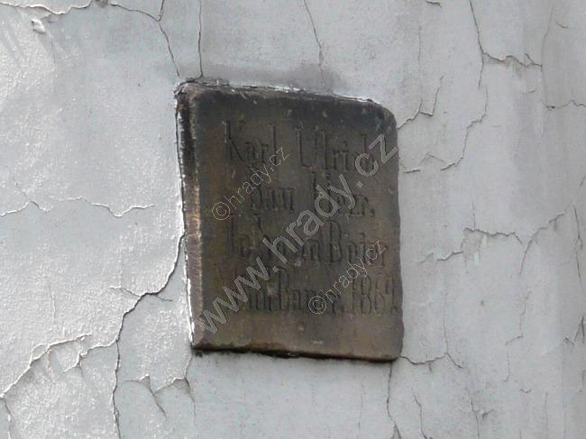 kamenná deska nad vstupem do mlýna informující o stavitelích mlýna v r. 1869