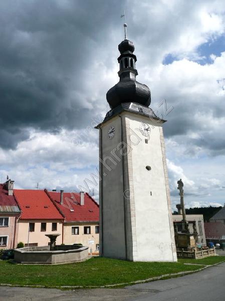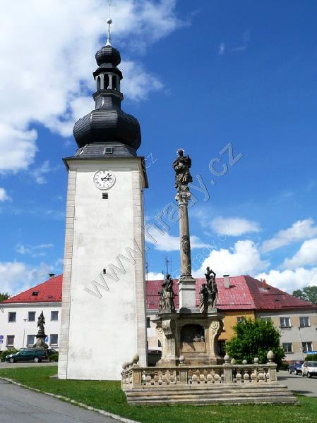 celkový pohled na Hodinovou věž a barokní morový sloup