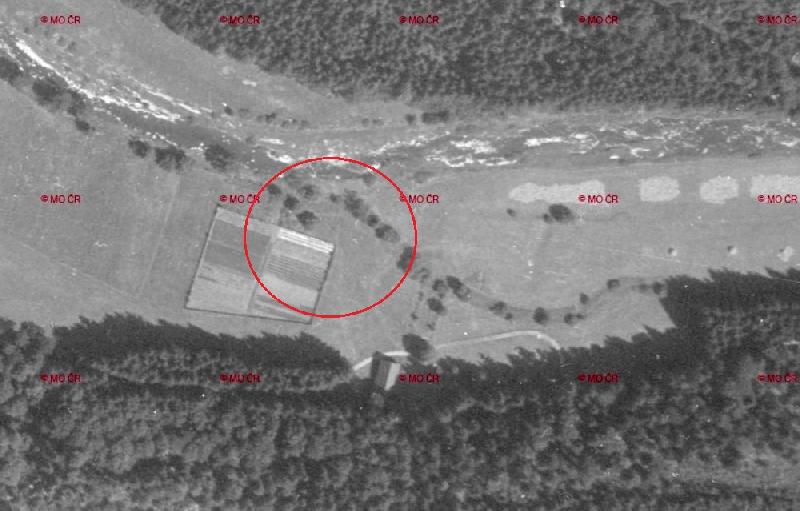 Vyznačení místa areálu zaniklého mlýna na leteckém snímku z roku 1947. Velmi hezky jde vidět místo, kudy se klikatil bývalý mlýnský náhon
