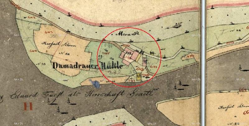 Vyznačení areálu mlýna mapovém podkladu Indikační skici ze 30. let 19. století