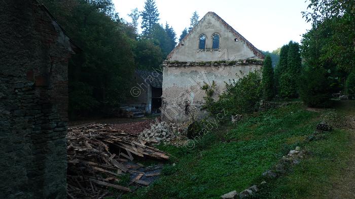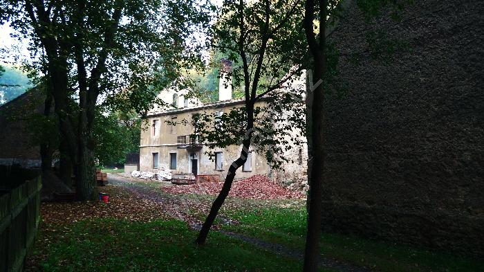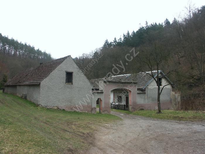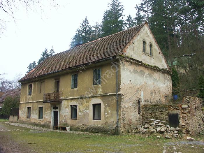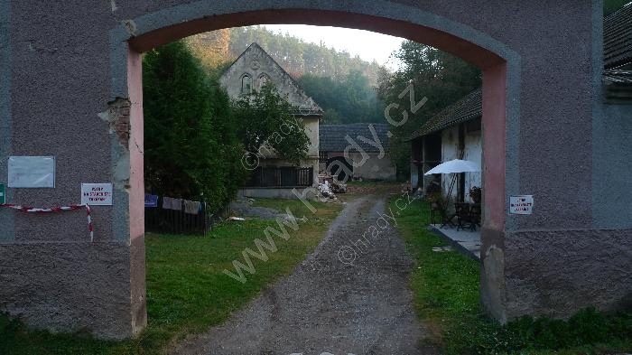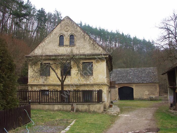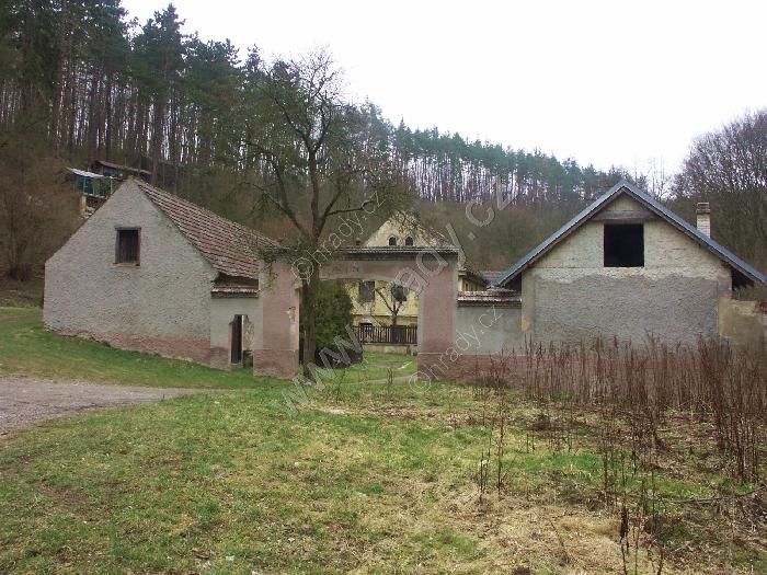 Za branou vpravo je budova bývalého hostince, který provozoval do roku 1958 pan Josef Kalina. Ve mlýně není zavedena elektřina, takže pivo se pumpovalo ručně.