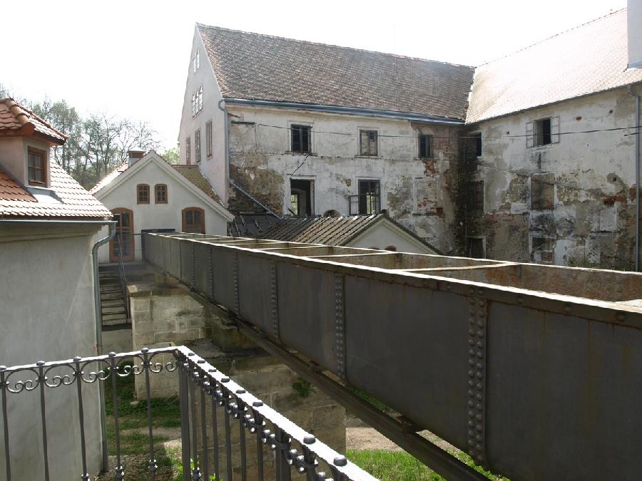 Pohled na dvůr mlýna z hráze Staroměstského rybníka