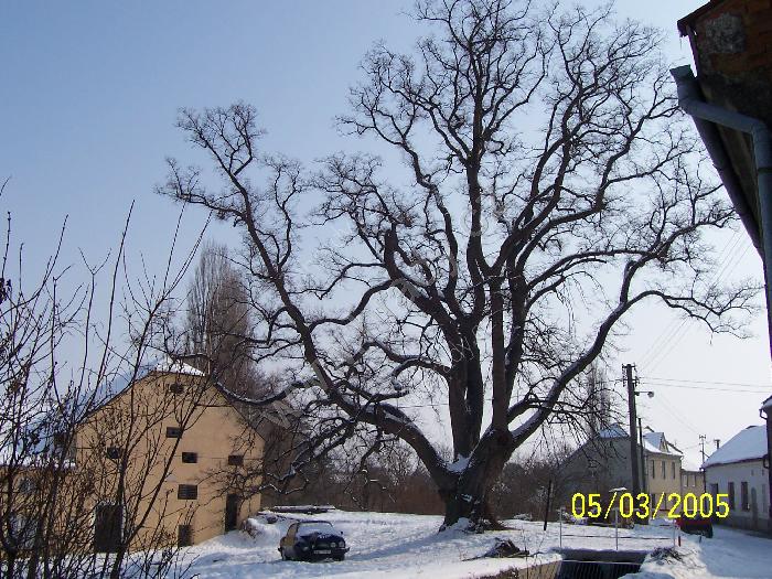 Znatelný kruh u předního kola automobilu naznačuje místo bývalé pětisetleté lípy.