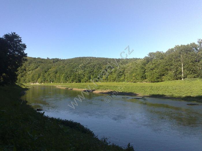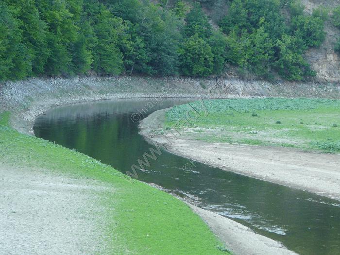 zátočina u Zouvalky při sníženém stavu řeky Svratky. Pruh pod lesem značí normální výšku přehrady