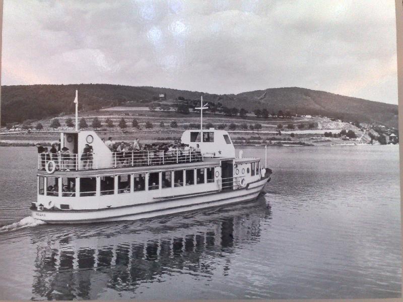 Dvoupalubová loď Praha.Na pozadí nezastavěná Kozí Horka. Fotografie z výstavy 140 let městské dopravy v Brně