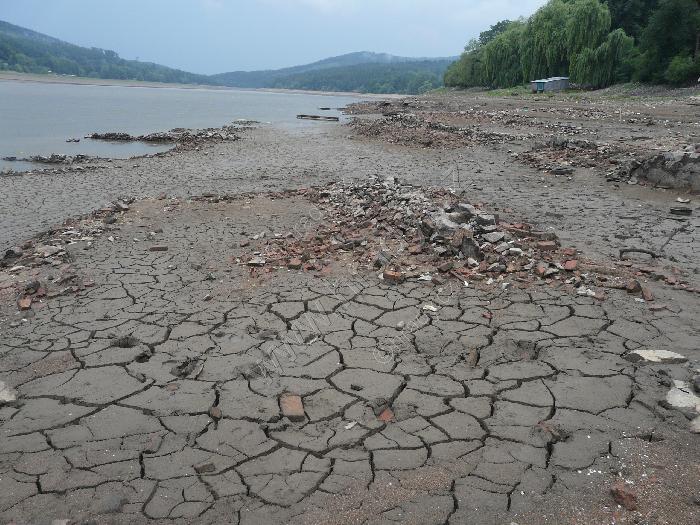 přehrada při sníženém stavu - zbytek zatopené obce Kníničky