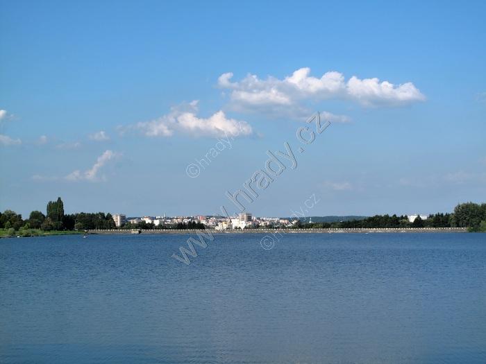pohled přes hladinu přehrady Olešná na nehezké dominanty současného Frýdku a Místku