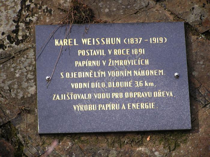 pamětní deska zasazená ve skále nad kanálem u jediného mostu křižujícího kanál