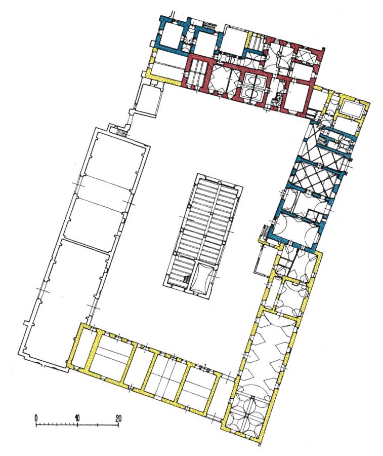 (in F. Musil, M. Plaček, J. Úlovec: Zaniklé hrady, zámky a trvze Čech, Moravy a Slezska po roce 1945) Červeně označené je zdivo z počátku 16. století; modře zdivo ze závěru 16. století; žlutě zdivo z 18. století, zbytek je z mladších období