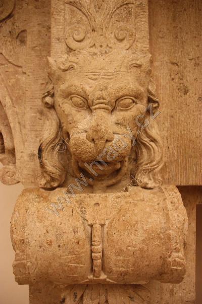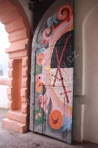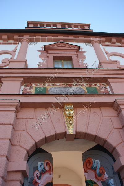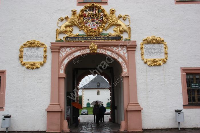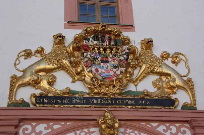 Velký kurfiřtský znak nad nádvorním portálem jižní brány do hlavní zámecké budovy