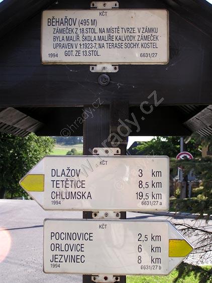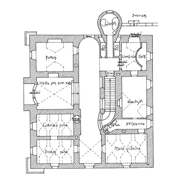 Běhařov, návrh částečně realizované úpravy zámecké budovy od architekta Josefa Štěpánka z roku 1923. Plán byl uložen až do povodně v srpnu 2002 v archivu Národního technického muzea v Praze. Kresba Jiří Úlovec