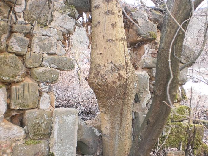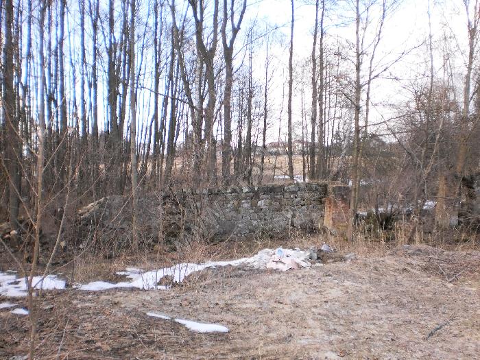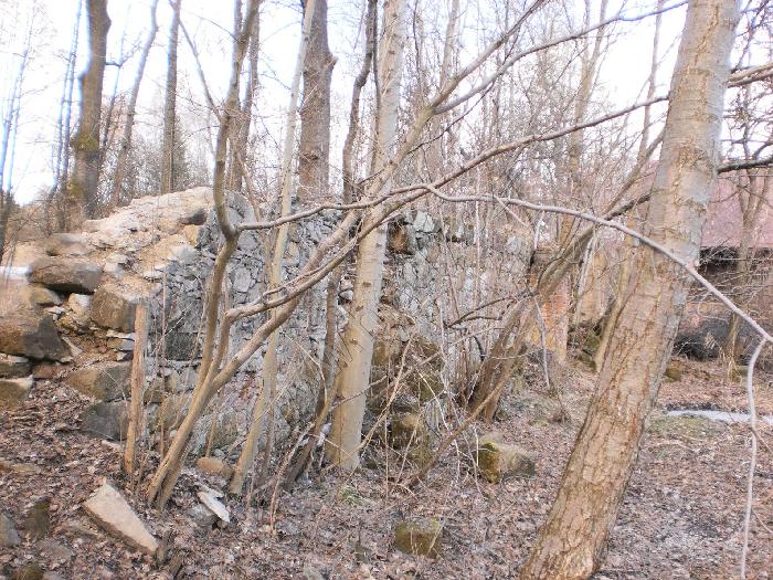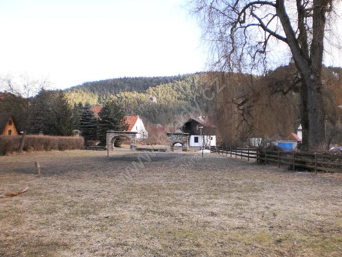 Pohled na místo Berkovského zámečku z hradu Sloup. Uprostřed jediné zachovalé zbytky zámečku - dvě brány.