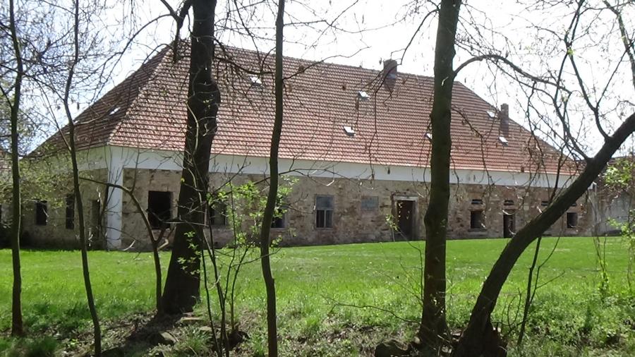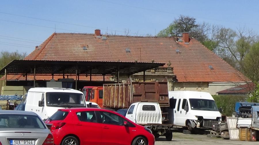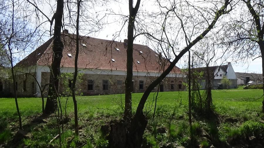 Bílence, pohled na přední stranu zámku schovanou v areálu hospodářského dvora.