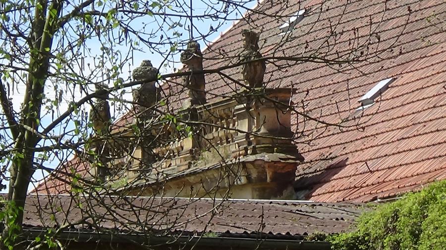 Barokní branka a na budově balustráda nad vchodovým rizalitem od severovýchodu.