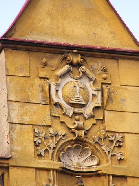 Erb Sobků z Kornic ve štítě jednoho z domů na náměstí naproti zaniklému zámku
