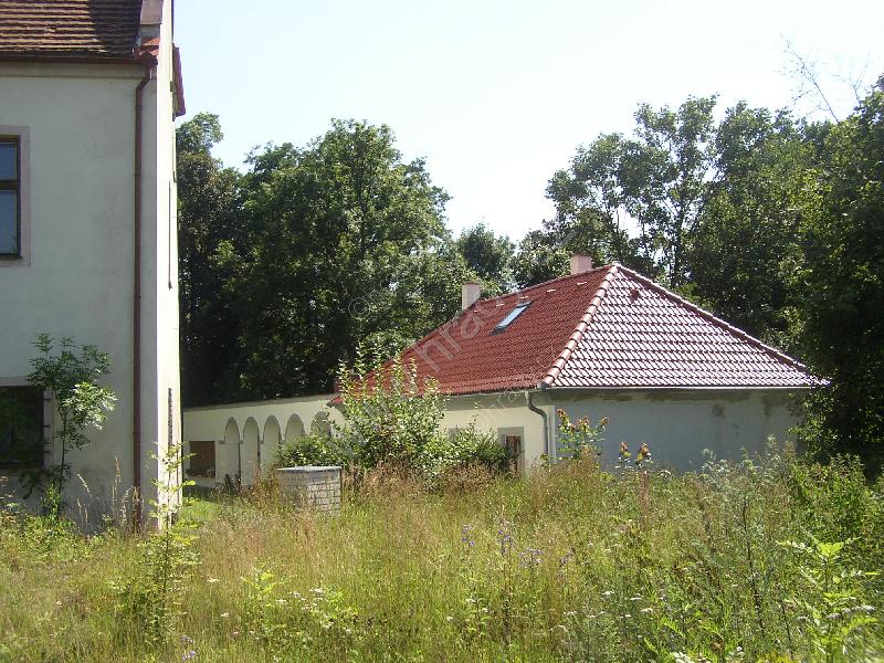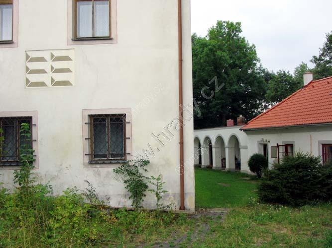 Zachovalé sgrafito na fasádě zámku, v pozadí arkády.
