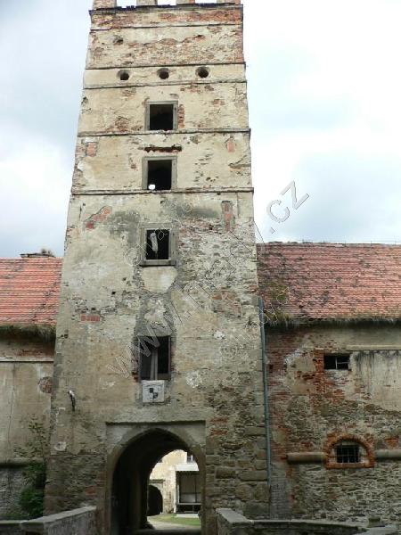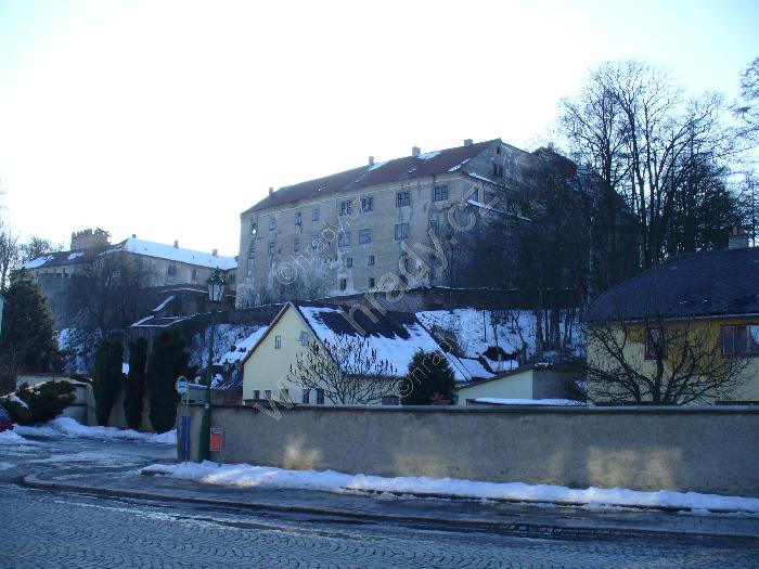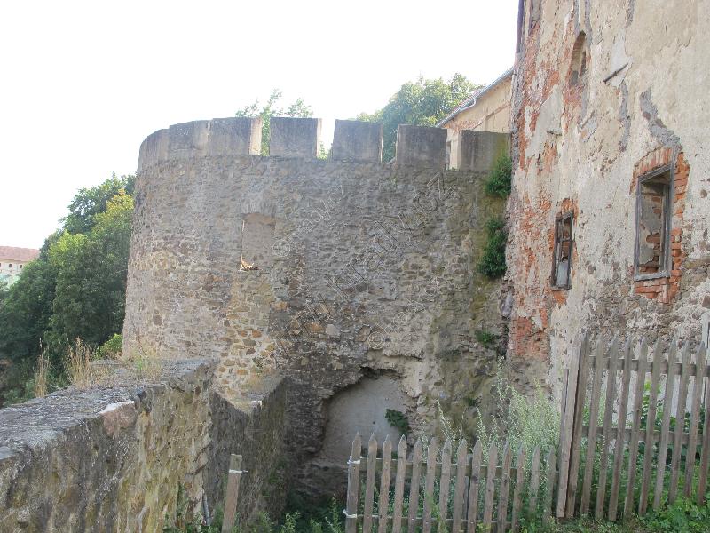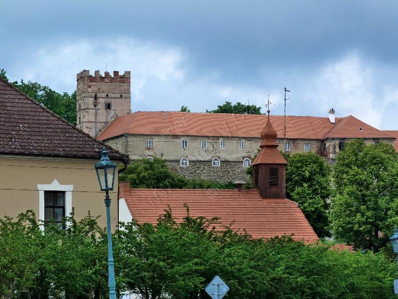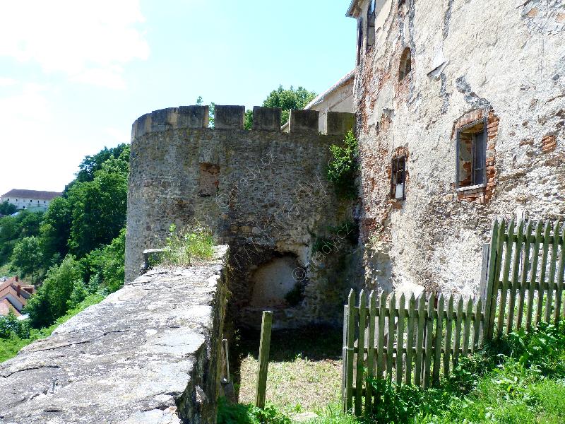 Z druhého nádvoří pohled na jednu stranu a obranou věž. částečně i kousíček města Brtnice