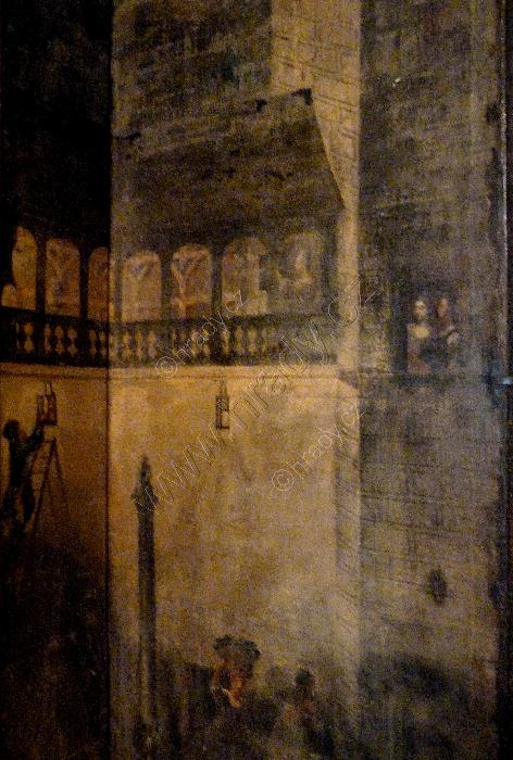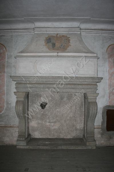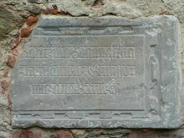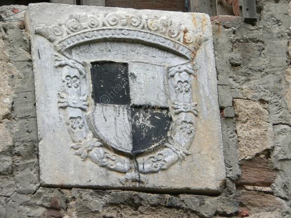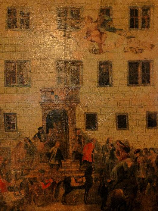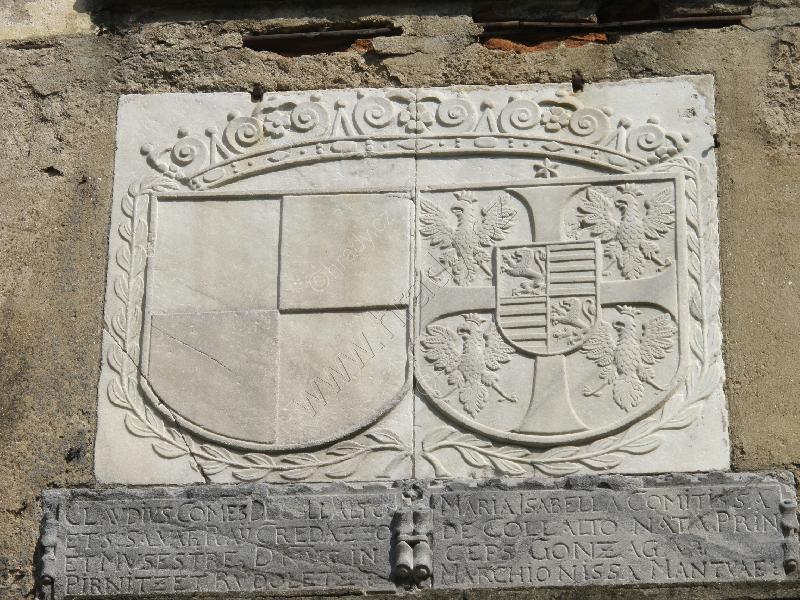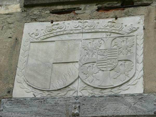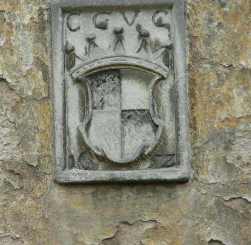 Tabulky a erby na 3.nádvoří - na pravé straně od kované kašny je vchod a nad ním tyto erby