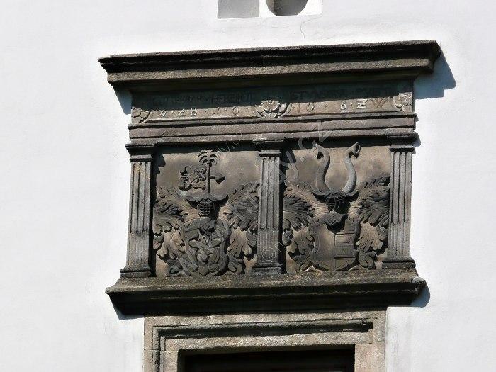 Napojení východního renes. křídla /vpravo/ se sev. barokním křídlem /vlevo/, v nároží schodišťová věž