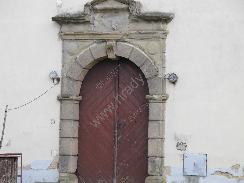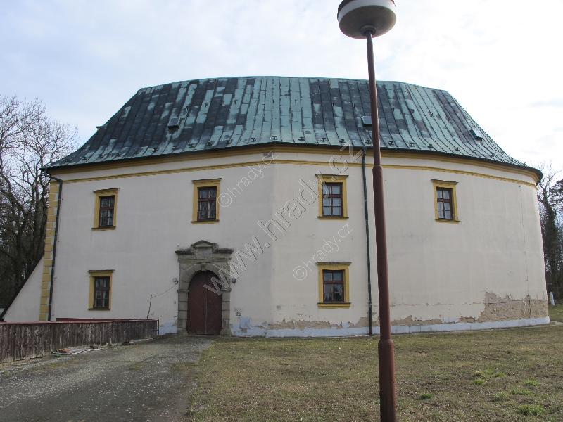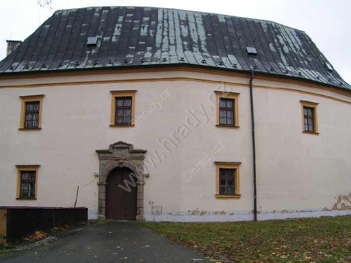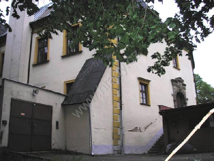 prává část hmoty budovy zámku obsahuje nejstarší zdivo bývalé tvrze, vlevo vystupuje mohutný opěrák