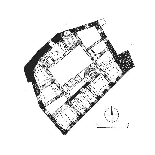 černě gotické zdivo, zrněně gotické zdivo zčásti dochované, šrafovaně renesanční zdivo, bíle pozdější zdivo