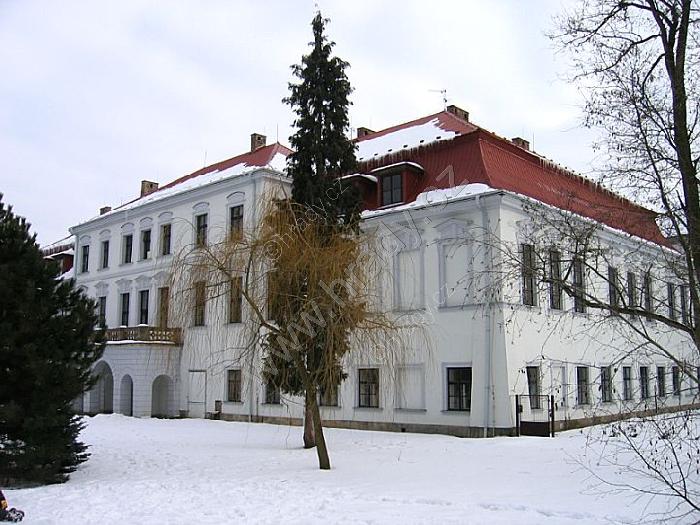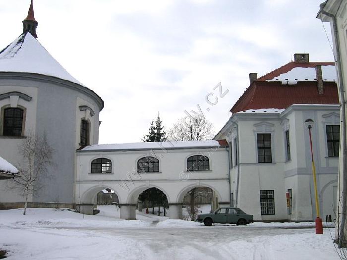 Pohled z parku se zámeckou studní krytou altánovou stříškou