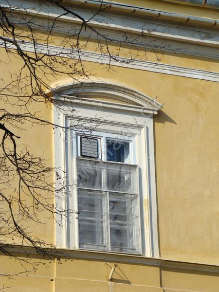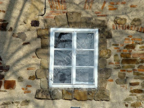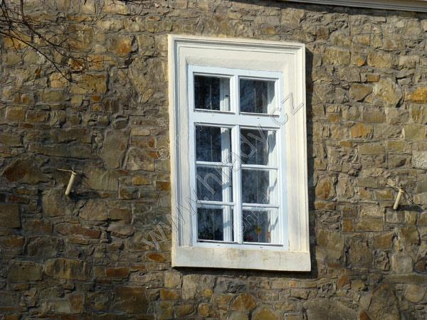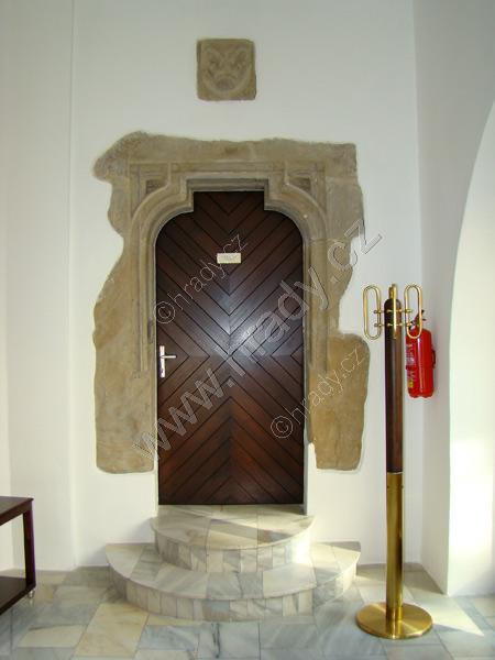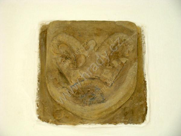 Celkový pohled na sekundárně umístěný sedlový portál s přetínavými pruty a erbovní štítek