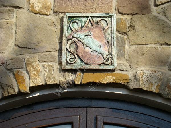 Detail keramického znaku Dolního Benešova umístěného na novodobé přístavbě, která propojuje na východě obě zámecká křídla.
