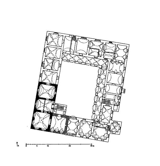 černě značena předpokládaná starší a křížkovaně mladší gotická fáze, mladší konstrukce neznačeny