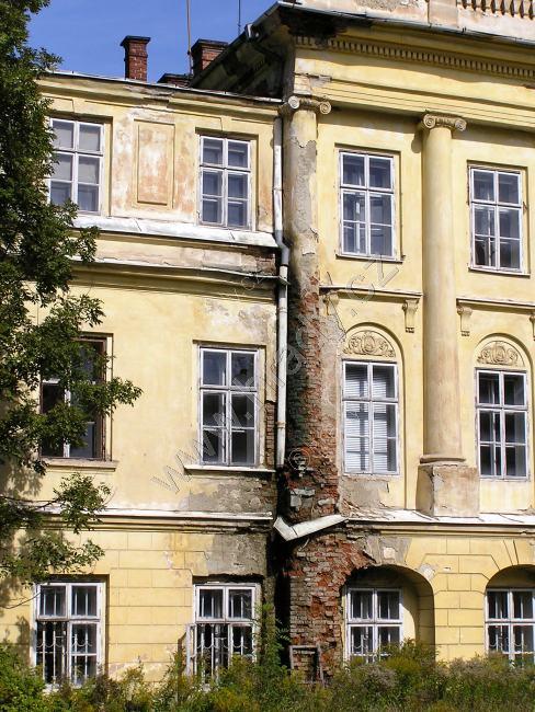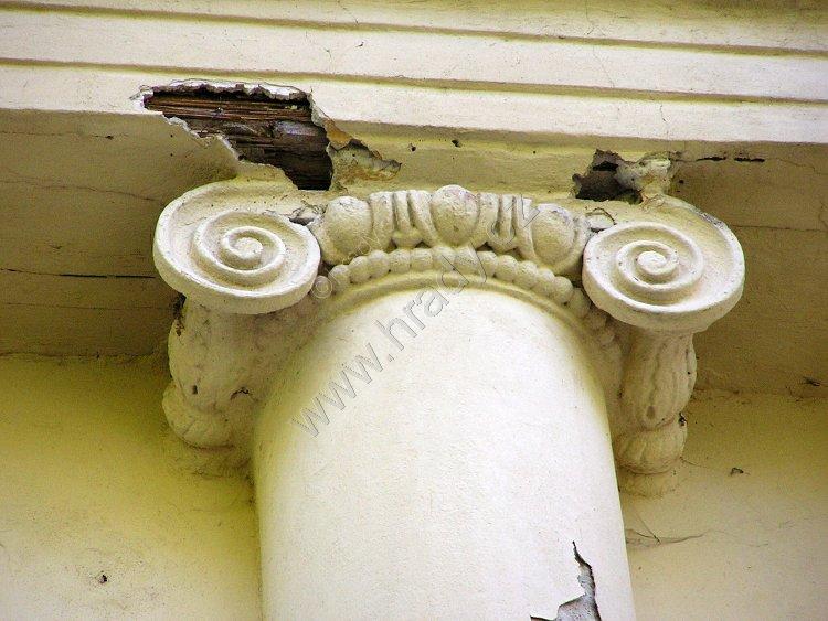 jeden z pilastrů zahradního průčelí, rozmoklý vlivem působení tekoucí vody z okapů