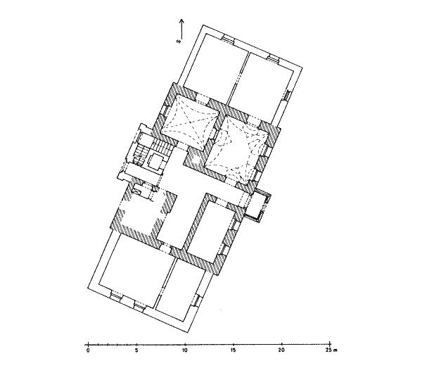Hořákov, plán přízemí zámku. Dvojité šrafy označují zdivo vzniklé před rokem 1880, mladší konstrukce neznačeny. Místnost při západním nároží nebyla za návštěvy bohužel přístupná. Zaměření Jiřího Úlovce z července 1989