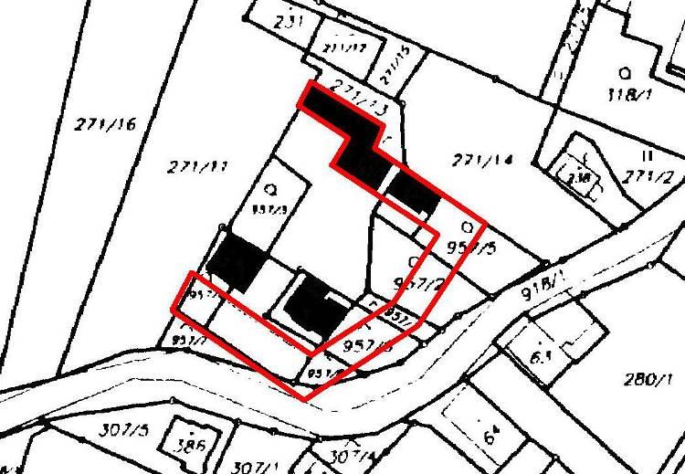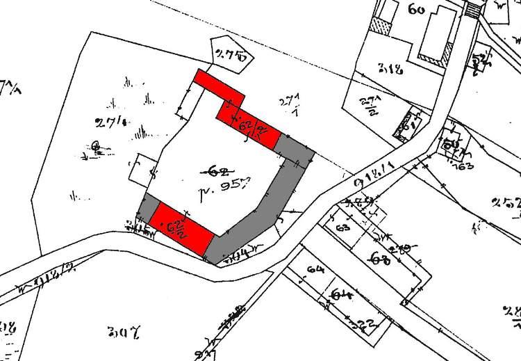 zákres obrysu původního dvora-zámku do současné katastrální mapy. Původní obrys zámku červeně, současná zástavba černě