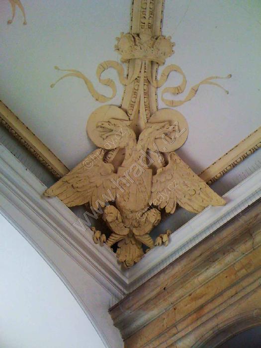 Dvouhlavá orlice, sedící na ozdobné římse (v průchodu zámku)
