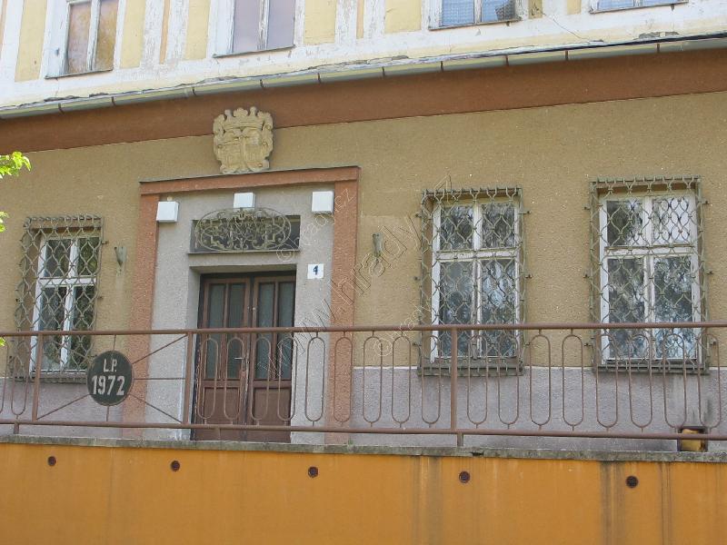 zrekonstruované přízemí s hlavním vhodem a erbem nad ním