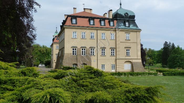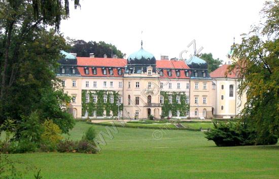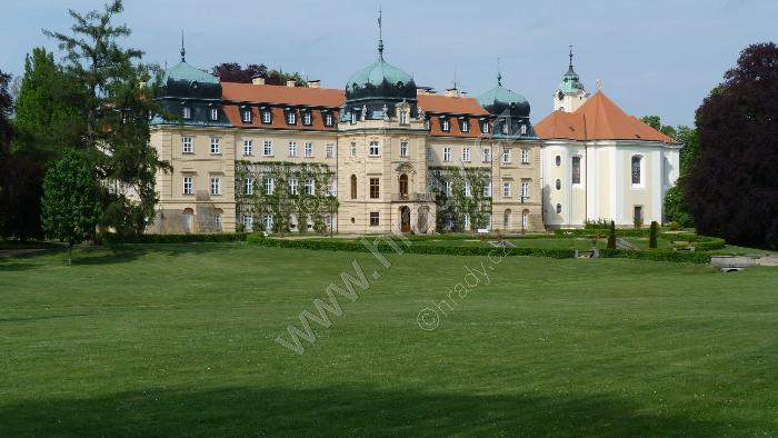 Celkový pohled na zámek a kostel z parku