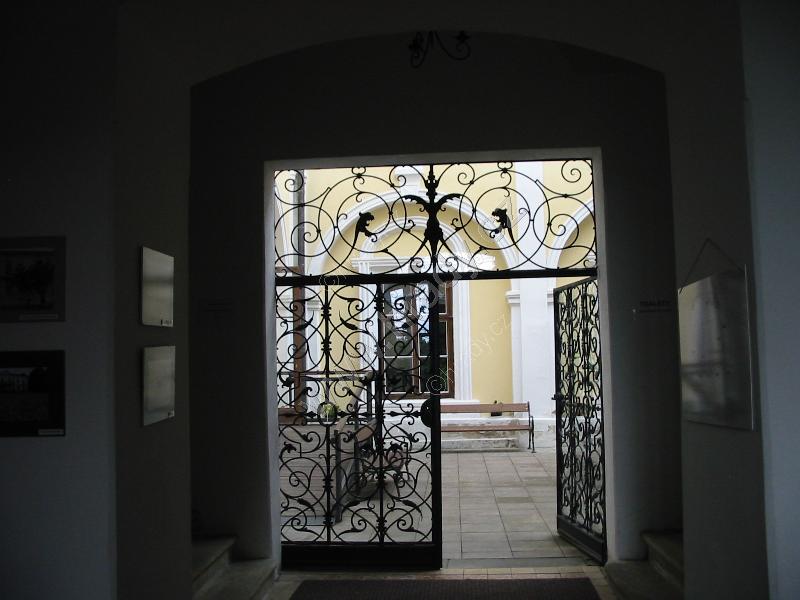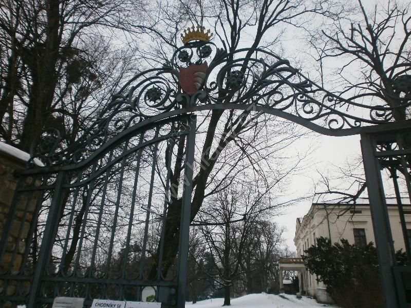 Vstupní brána do zámeckého areálu s erbem rodiny Kinských