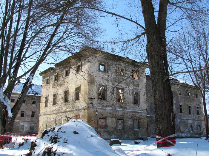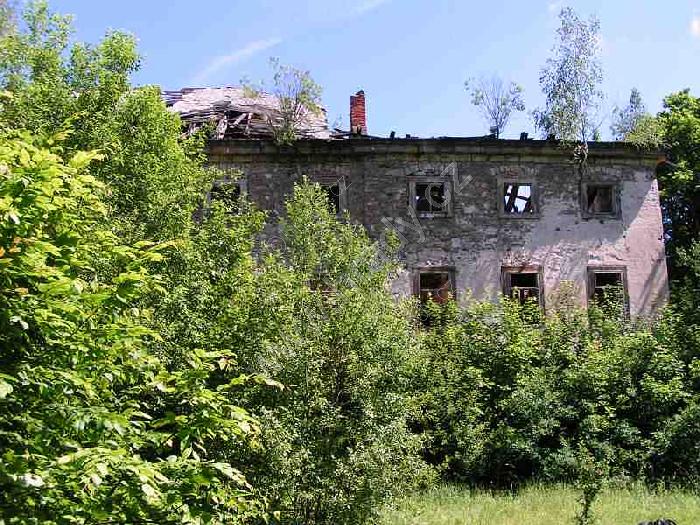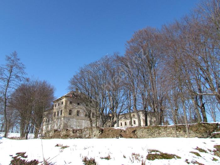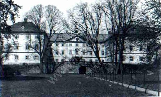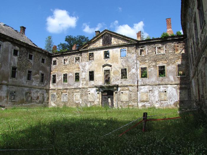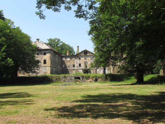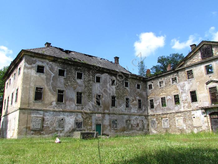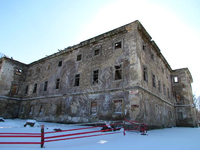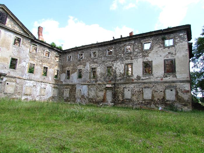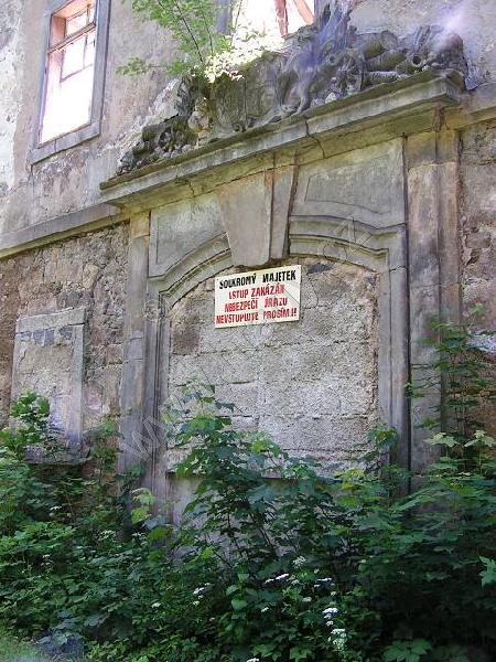 centrální a pravé křídlo zámku, pod tympanonem s hodinami zarostlý a zazděný vchod