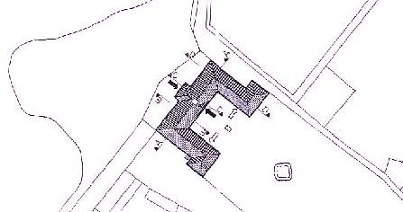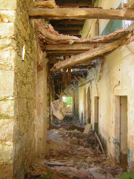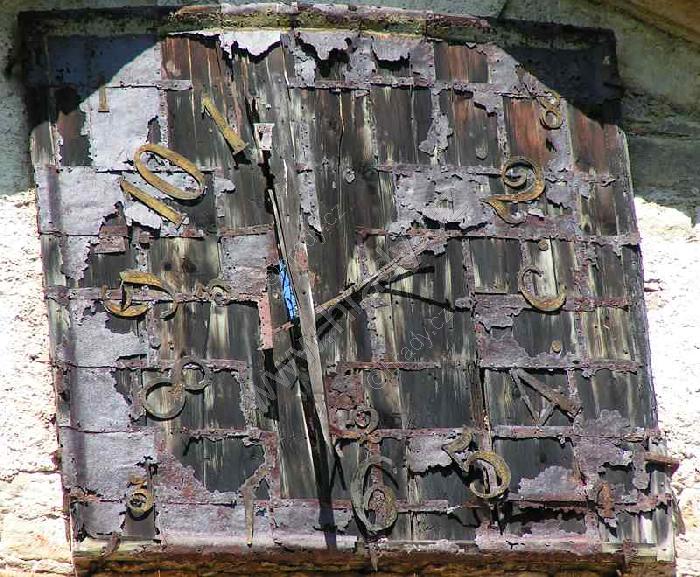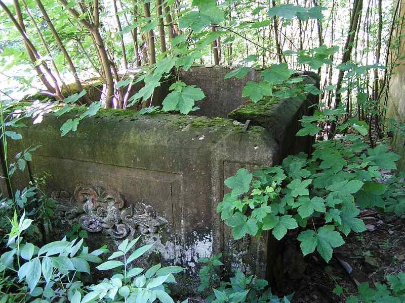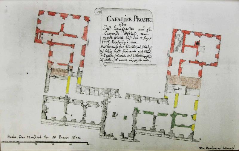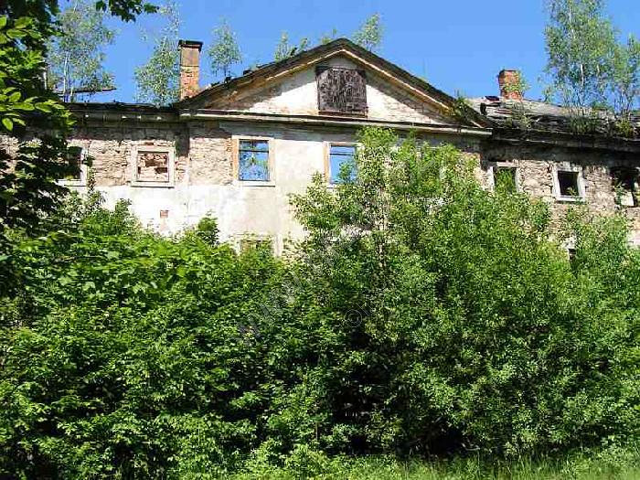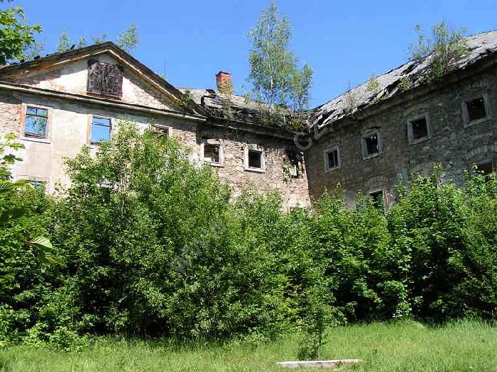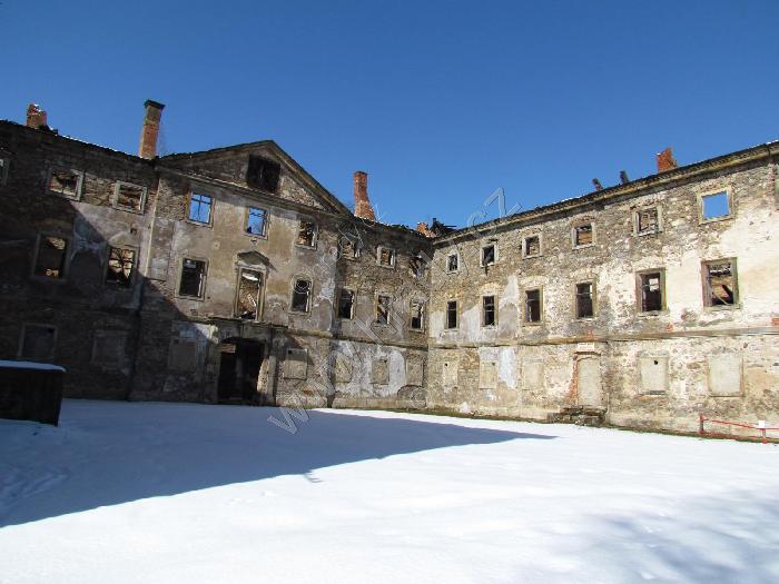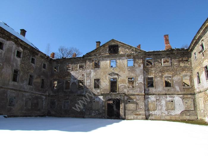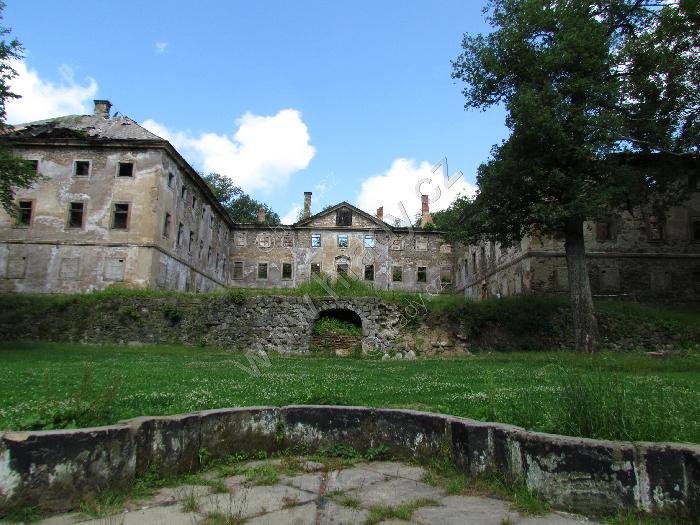 centrální a pravé křídlo zámku, pod tympanonem s hodinami zarostlý a zazděný vchod