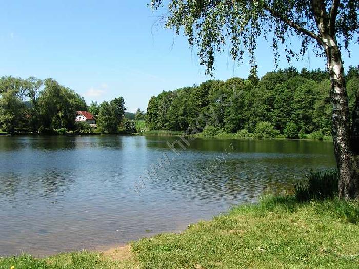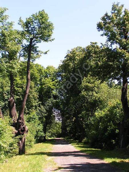 Alej na hrázi rybníka vede k zámecké budově v dáli. Rybník po levé ruce.