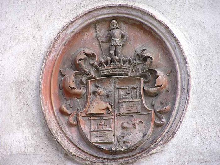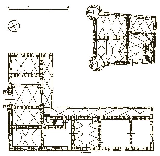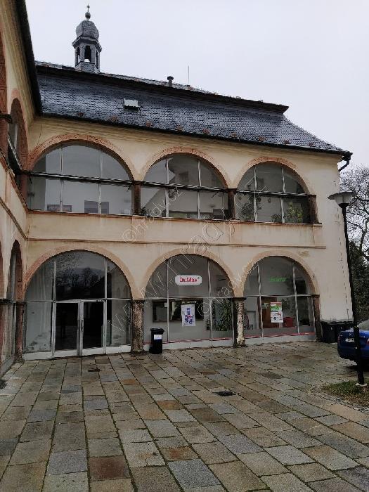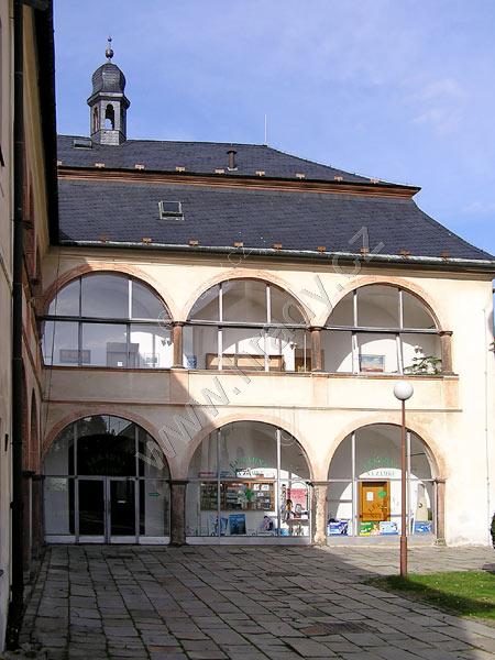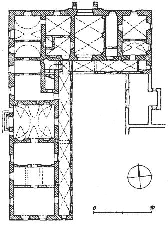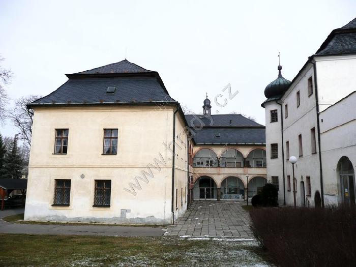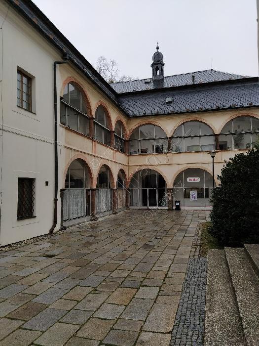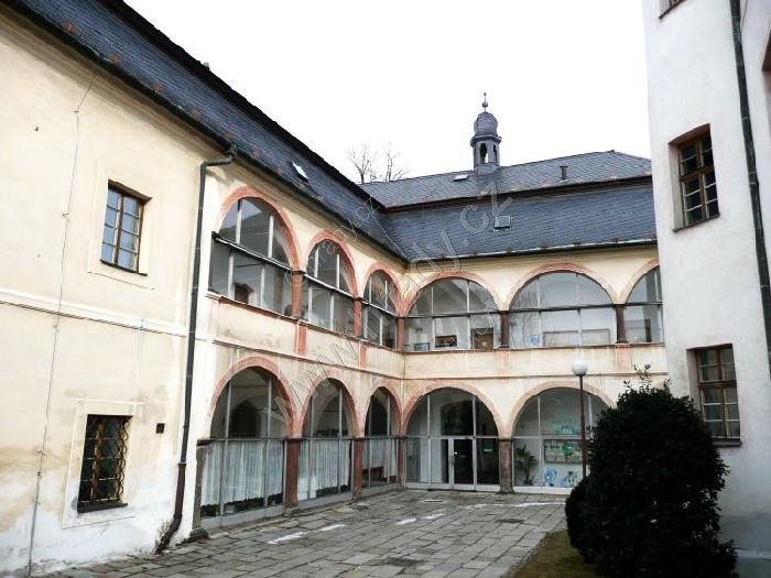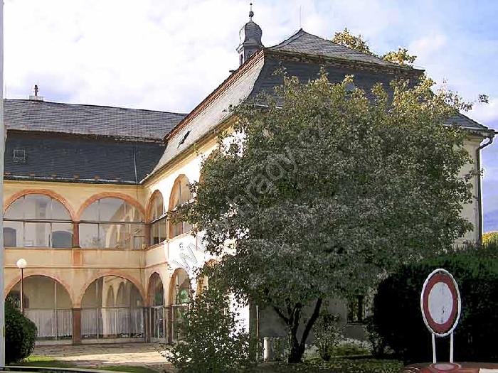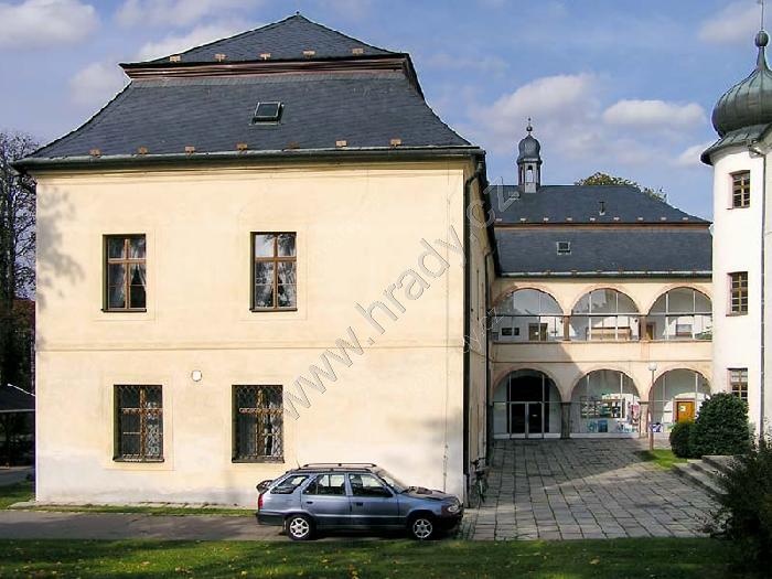 Nový zámek na půdoryse písmene L s arkádami a vpravo dvoupatrová budova starší tvrze