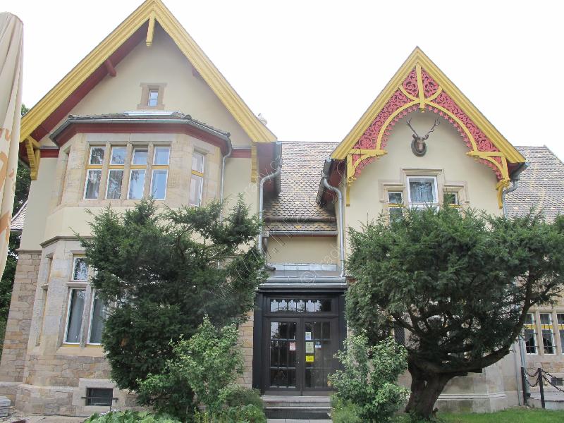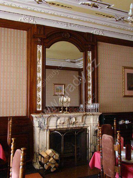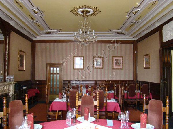 V interiéru budovy je nejvýraznější hlavní jídelna s krbem, která je vyzdobena v loveckém stylu.