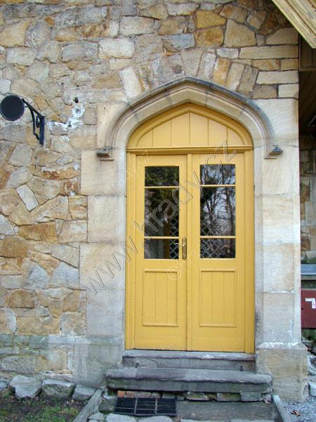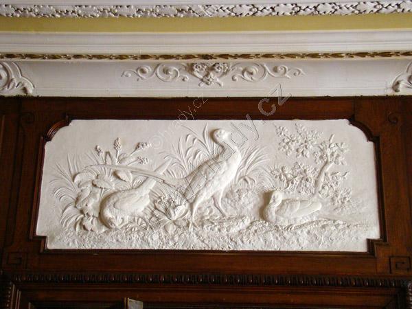 Detail lovecké výzdoby, která se nachází nad dveřmi.