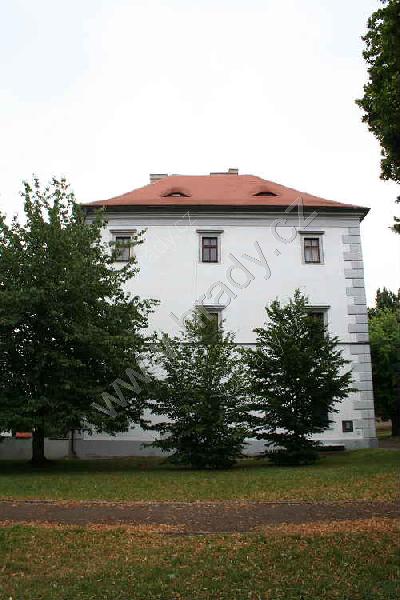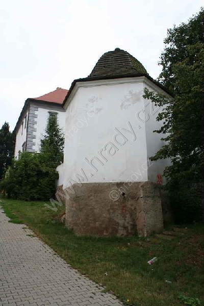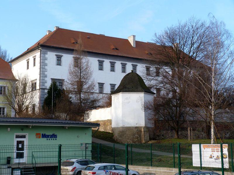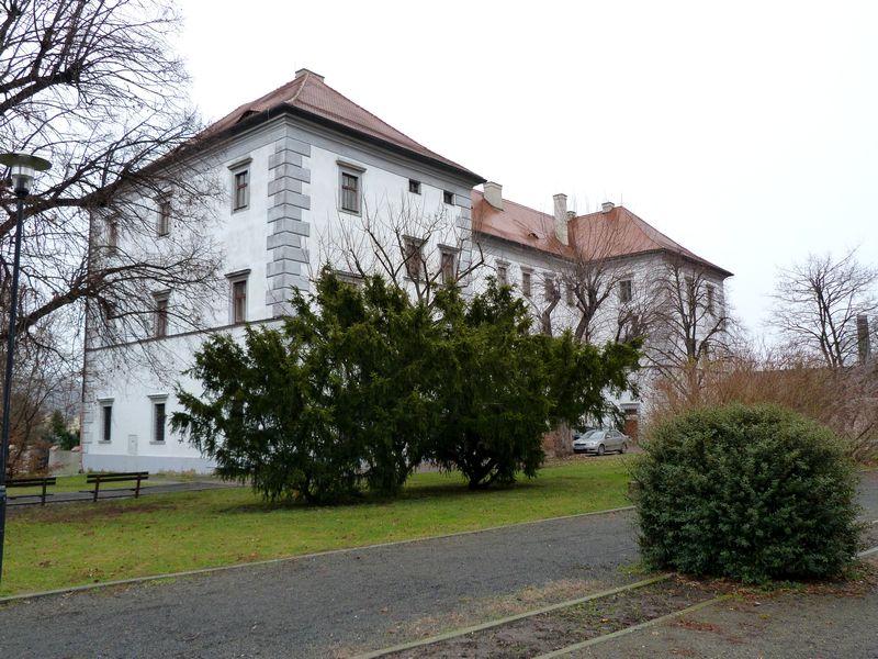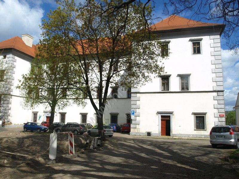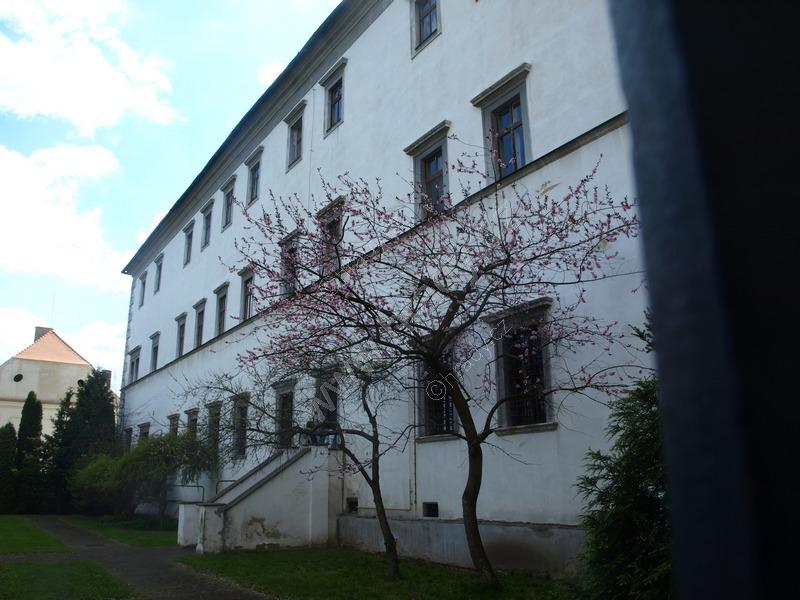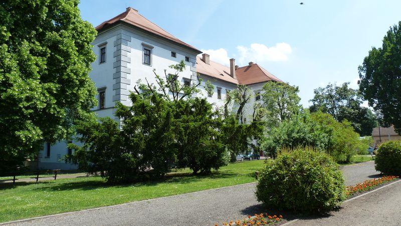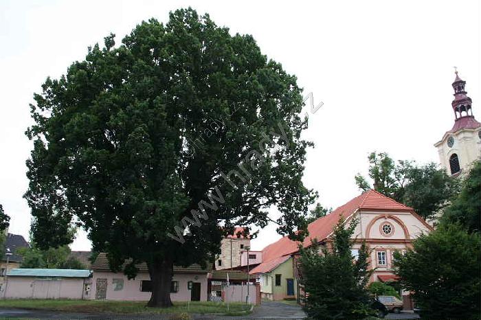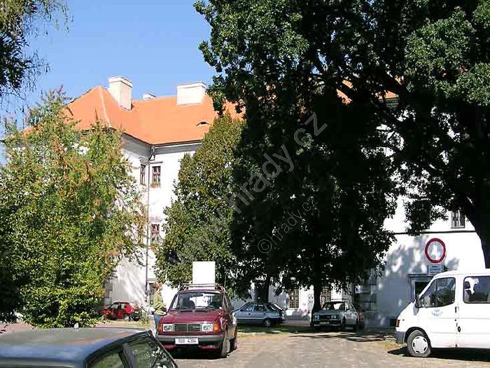 Památný dub, jižní část zámeckého dvora a kostelní věž