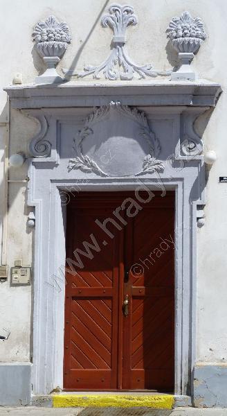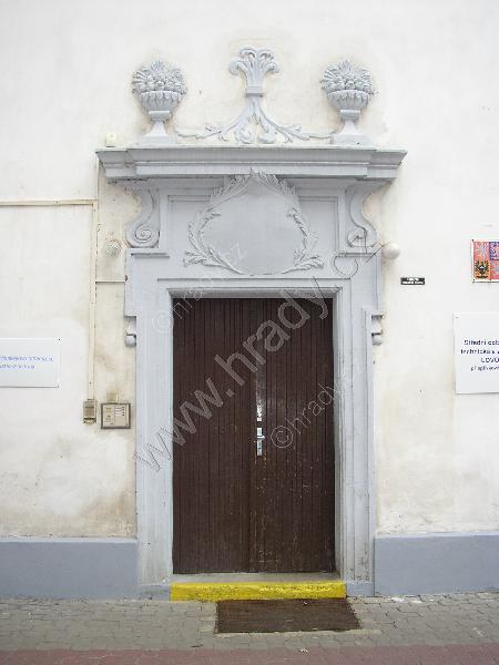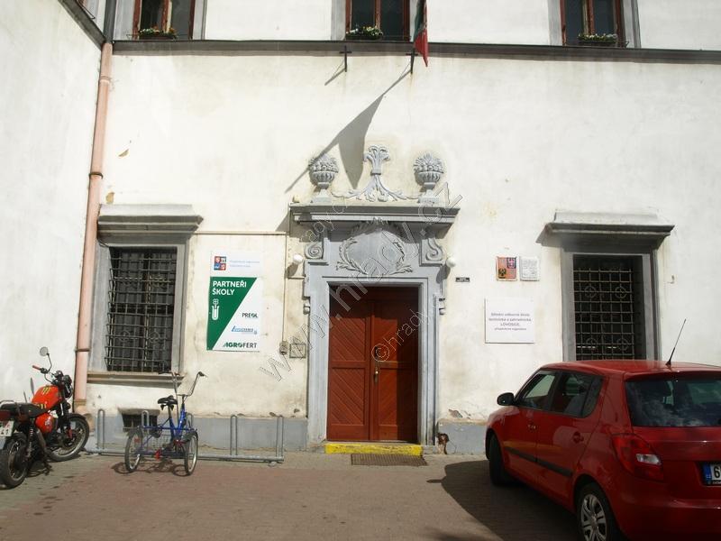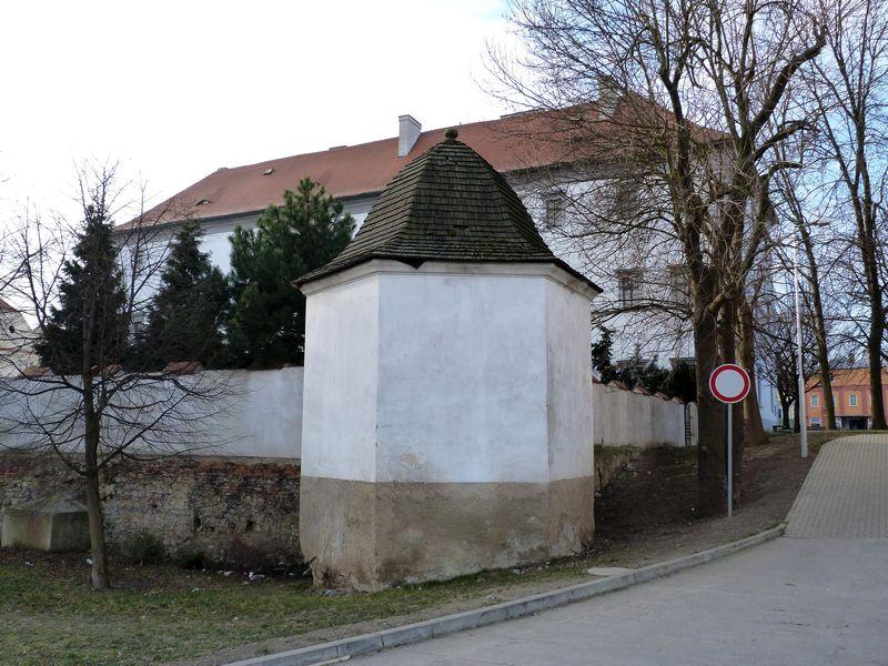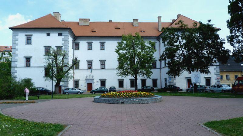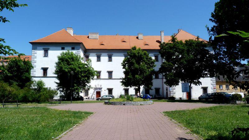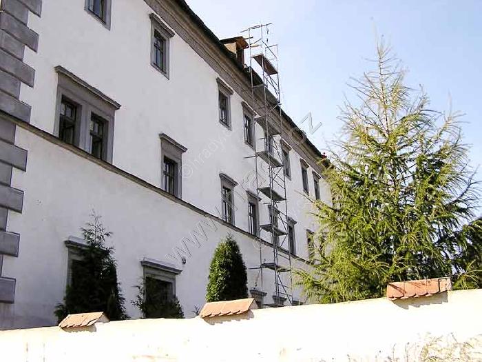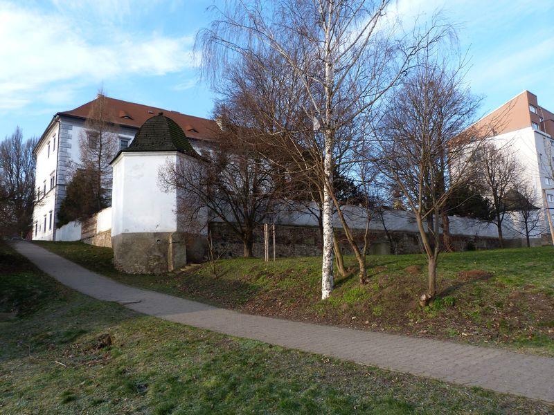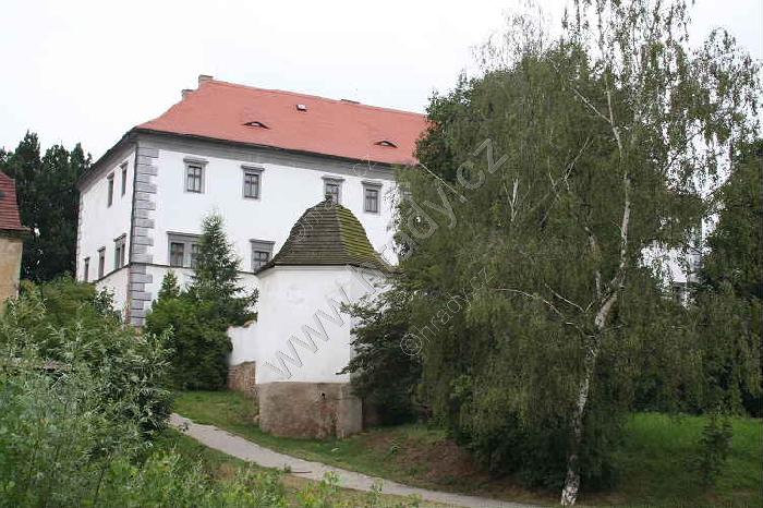Památný dub, jižní část zámeckého dvora a kostelní věž